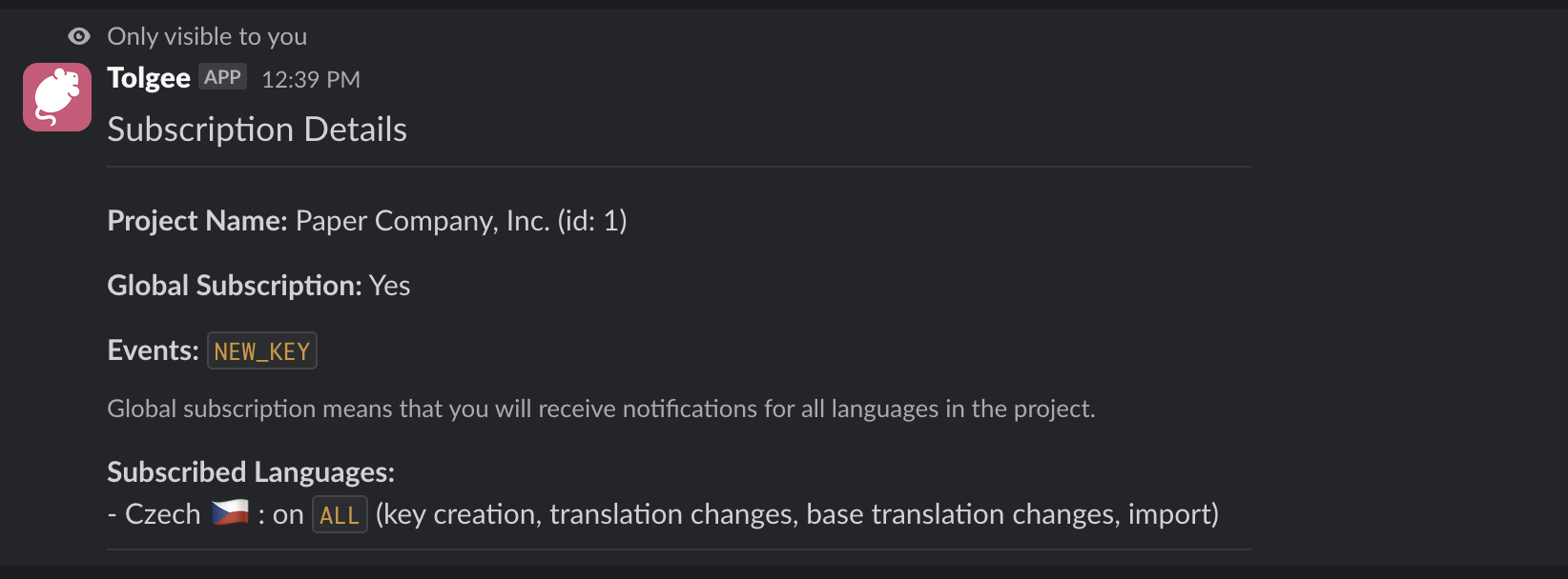 And if you wish to receive notifications only for French translations, you can set global subscription to false by typing /tolgee subscribe 1 --global false.